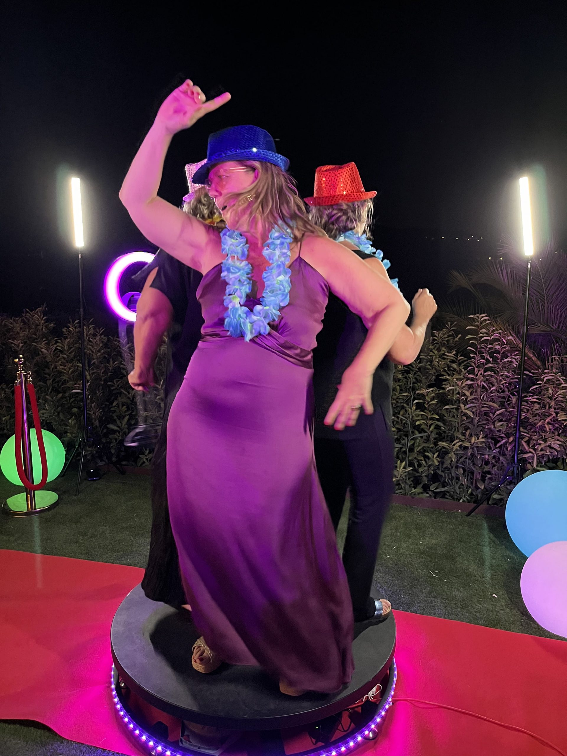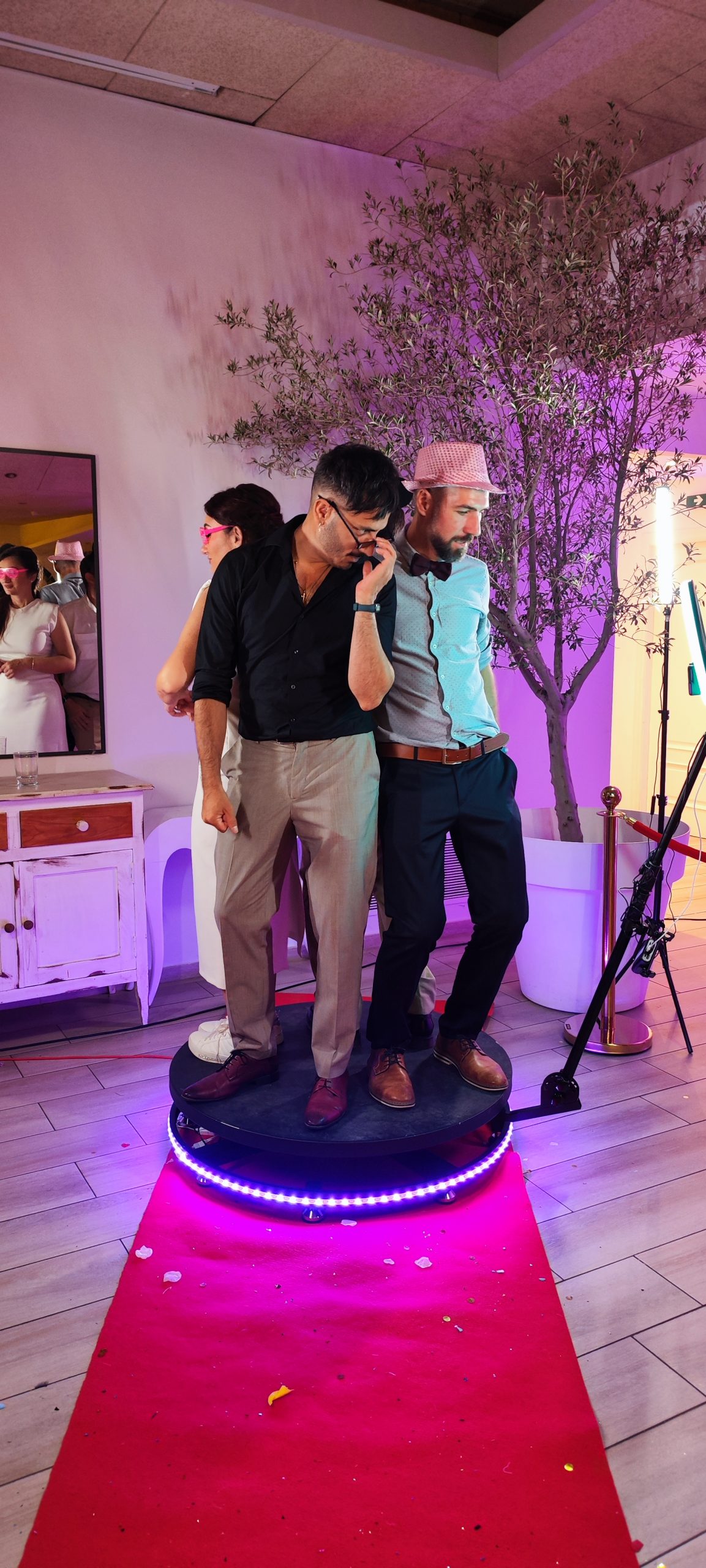 ¿Cómo funciona nuestro videomatón 360? Es fácil y divertido. Los asistentes se colocan en la plataforma, espalda contra espalda, siempre frente a la cámara. El equipo inicia la grabación con un simple clic, y la plataforma 360 comienza a girar alrededor, capturando cada momento de diversión.